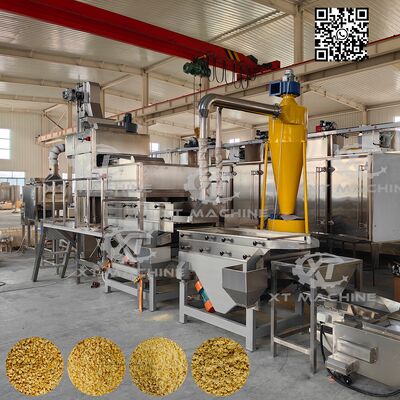 Η μηχανή διαθέτει μια διαδικασία τεμαχισμού δύο σταδίων. Τα ξεφλουδισμένα φιστίκια τροφοδοτούνται στον τεμαχιστή μέσω ενός κάθετου μεταφορέα, όπου αρχικά τεμαχίζονται σε χονδροειδή κόκκους από την πρώτη συσκευή τεμαχισμού. Το υλικό στη συνέχεια ρέει στη μονάδα τεμαχισμού του δεύτερου σταδίου, με αποτέλεσμα τη δημιουργία μικτών κοκκωδών. Μέσω του ενσωματωμένου δονητικού κοσκινίσματος, το τεμαχισμένο υλικό διαχωρίζεται σε τέσσερις ομοιόμορφες προδιαγραφές, συνήθως χωρισμένες σε 5-8 mesh, 8-10 mesh, 10-12 mesh, με υλικό κάτω από 12 mesh να επιτυγχάνει υφή σκόνης.